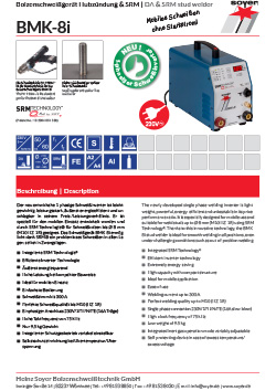 BMK-8i je ľahký, výkonný, energeticky efektívny zvárací zdroj, ktorý umožňuje priváranie svorníkov v magnetickom poli s využitím technológie SRM. Jeho výhodou sú malé rozmery, nízka hmotnosť a nenáročnosť na napájaciu sieť. Zariadenie poskytuje stabilný výkon, kvalitu zvárania a flexibilitu.